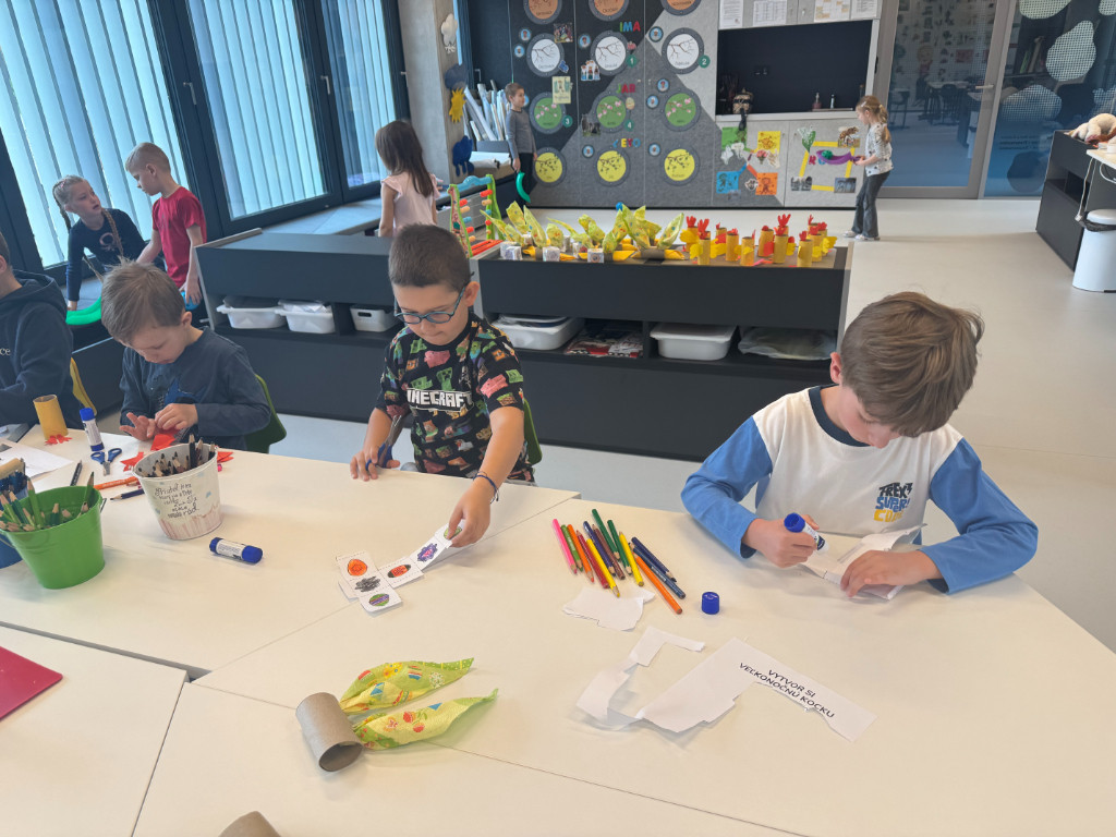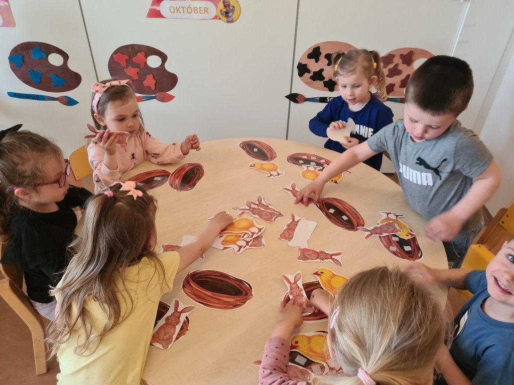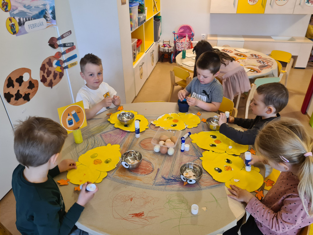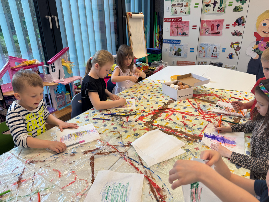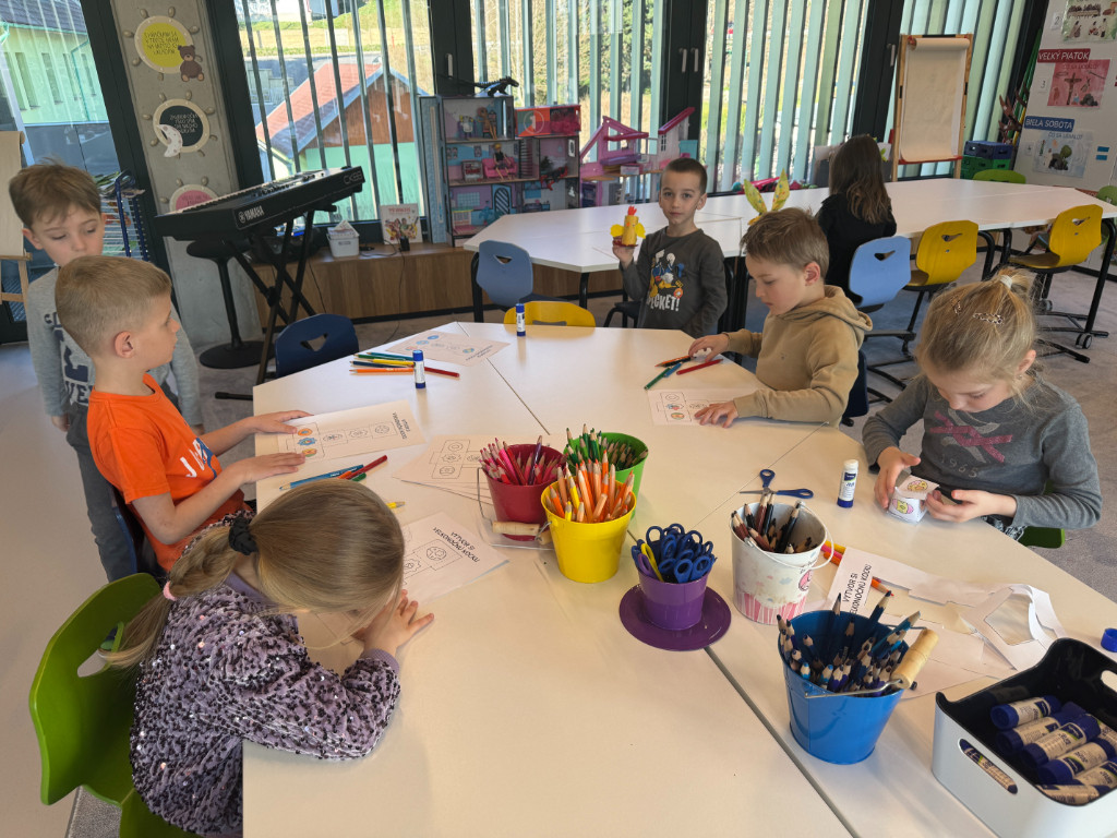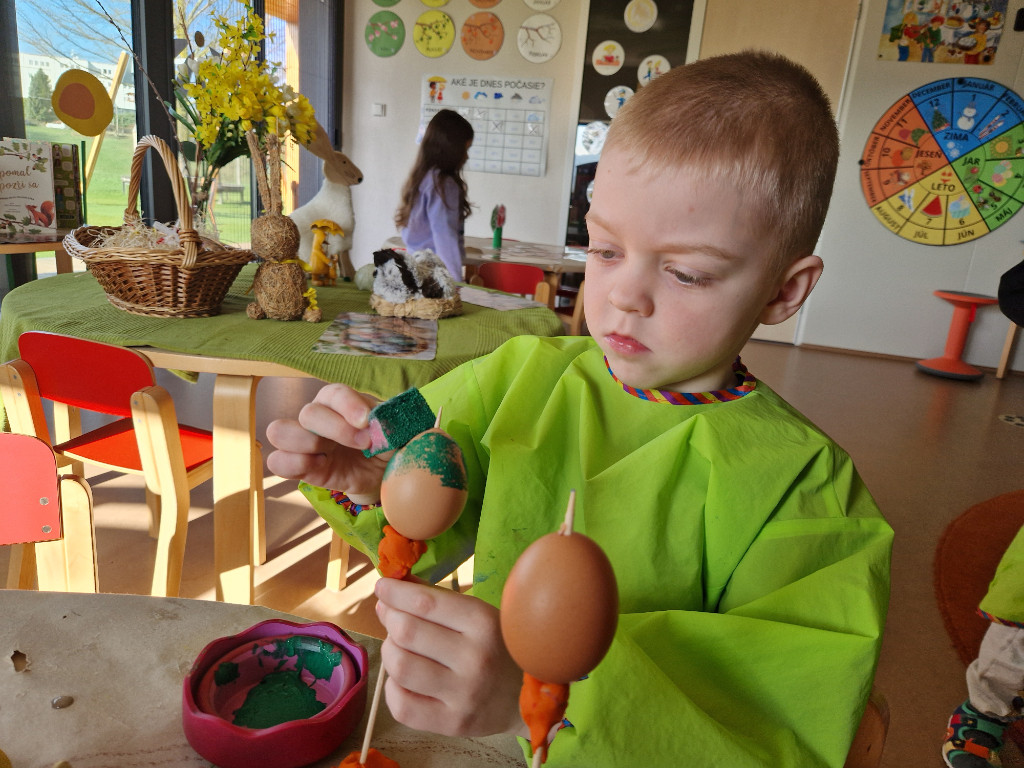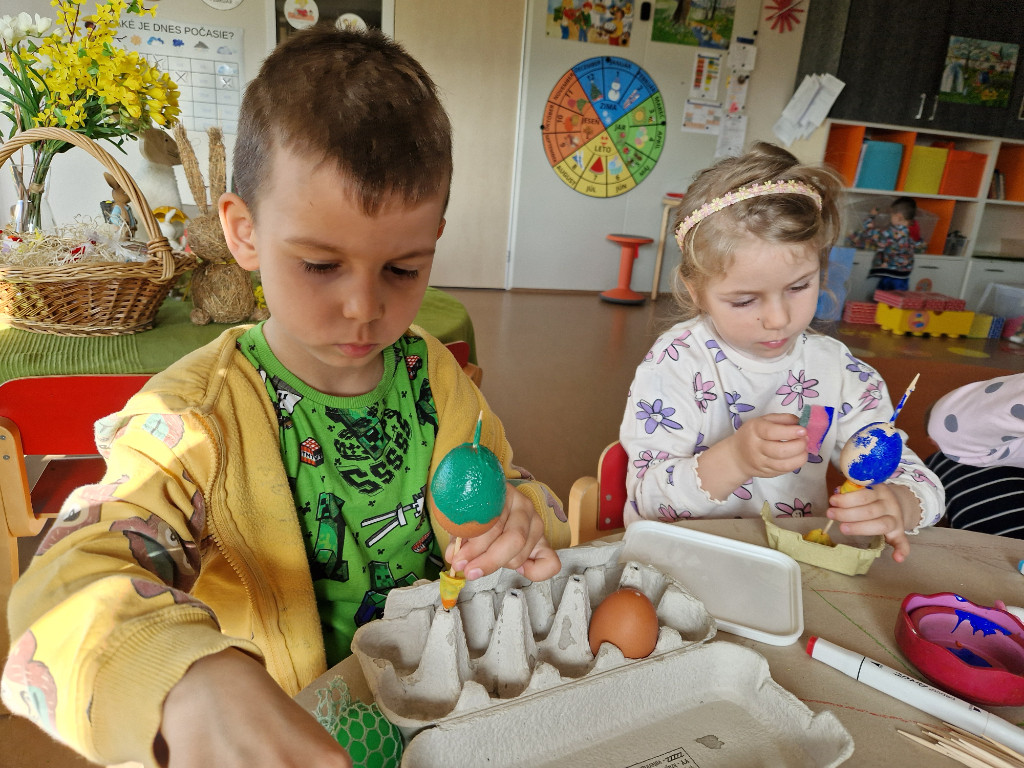 V našej triede Veľkáčov zavládla pred Veľkou nocou tvorivá atmosféra. S radosťou sme sa pustili do maľovania veľkonočných vajíčok – niektoré boli bodkované, iné pásikavé alebo plné pestrých farieb a kvetov. Okrem toho sme si vyrobili aj vlastné papierové vajíčka, ktoré sme krásne vyzdobili. Žilo to u nás farbami, smiechom a jarnou veľkonočnou náladou.