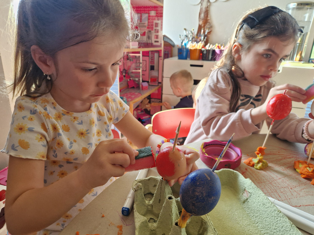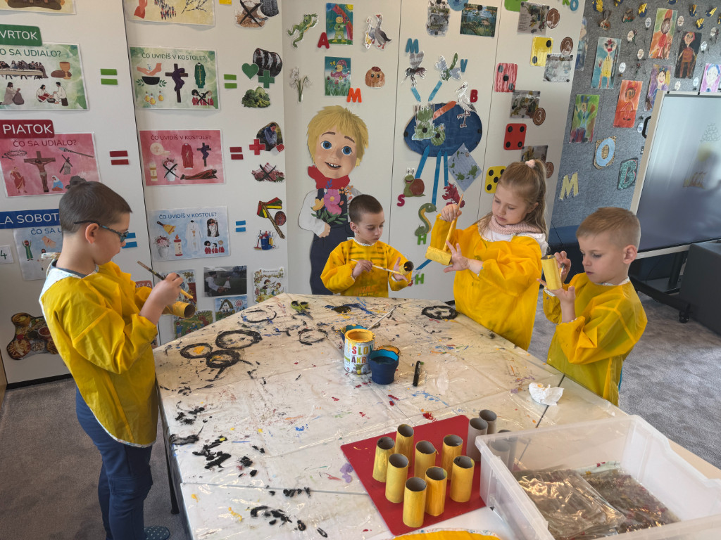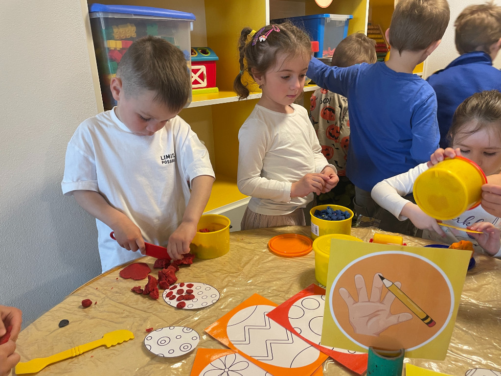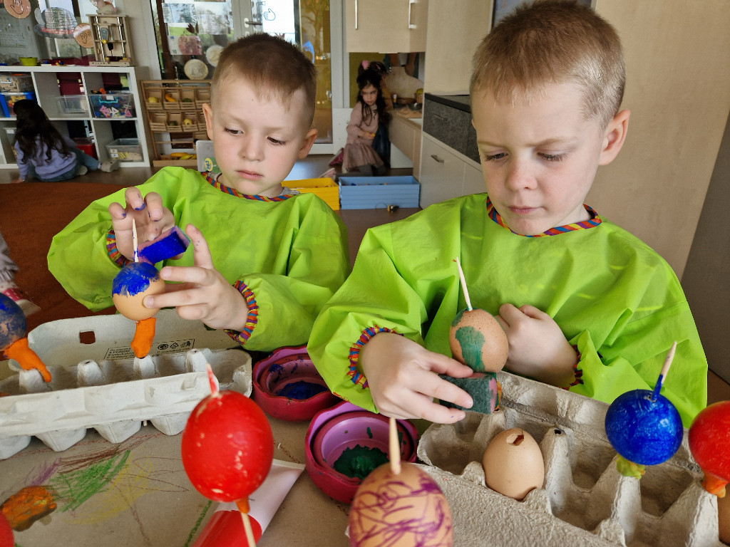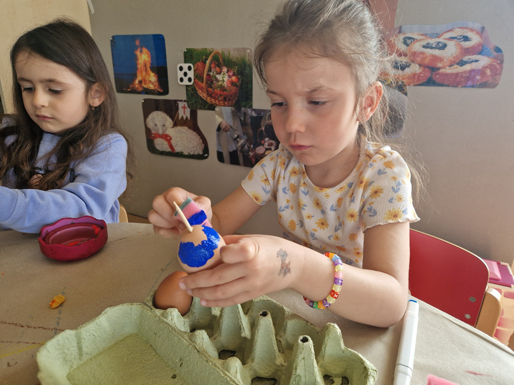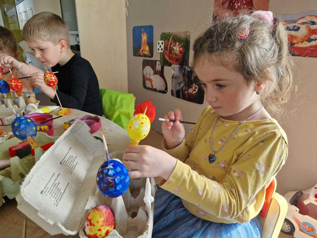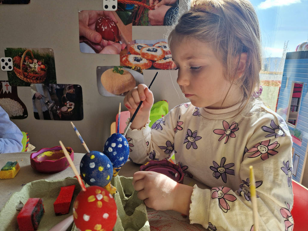 V našej triede Veľkáčov zavládla pred Veľkou nocou tvorivá atmosféra. S radosťou sme sa pustili do maľovania veľkonočných vajíčok – niektoré boli bodkované, iné pásikavé alebo plné pestrých farieb a kvetov. Okrem toho sme si vyrobili aj vlastné papierové vajíčka, ktoré sme krásne vyzdobili. Žilo to u nás farbami, smiechom a jarnou veľkonočnou náladou.